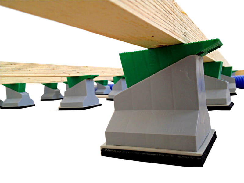 System poziomowania złożony ze stopki i klina może być stosowany w każdym miejscu, w którym zajdzie potrzeba podniesienia i wypoziomowania legarów na częsci lub całości powierzchni.